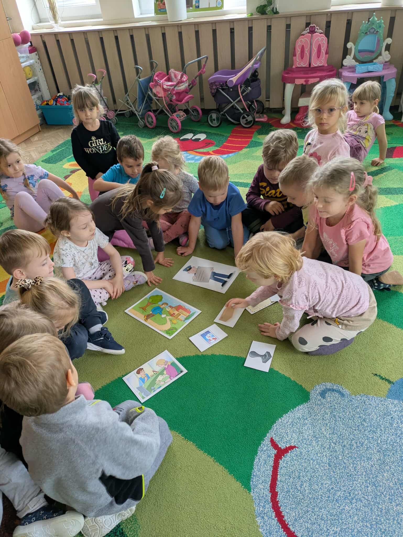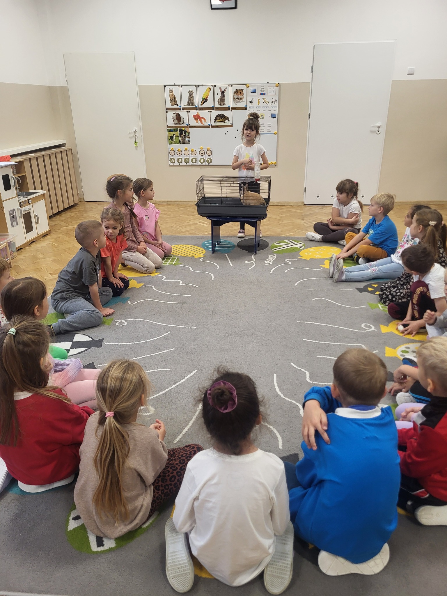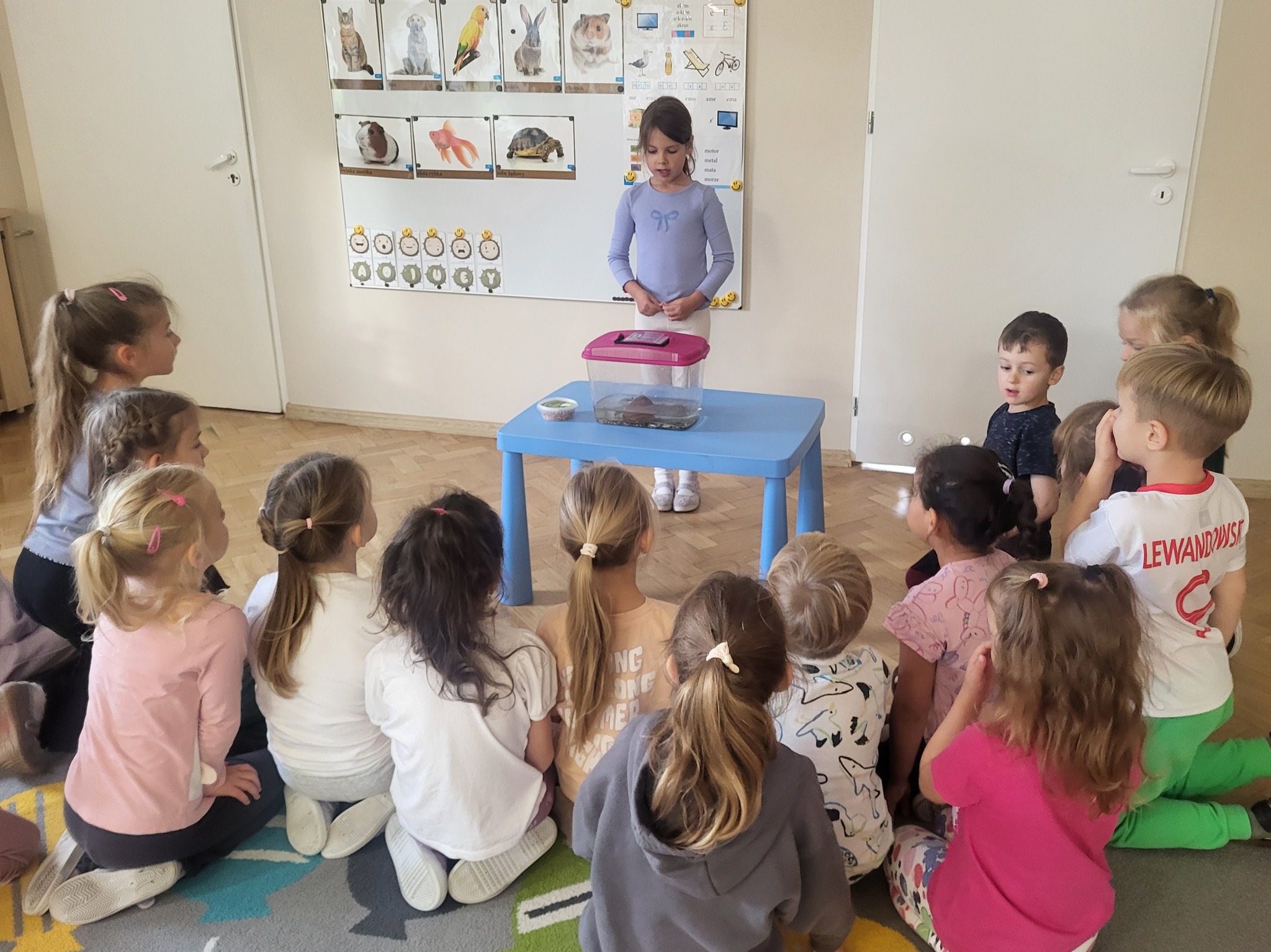 Krasnoludki uczyły się o zwierzętach domowych. Dzieci przynosiły swoich ukochanych pupili – żółwia, królika, chomika, kotka, pieski, a nawet rybki! Z ogromnym entuzjazmem opowiadały o swoich zwierzątkach – zdradzały ich imiona, opowiadały, czym się żywią, jak należy o nie dbać i jakie mają zwyczaje. To była wspaniała okazja, by porozmawiać o odpowiedzialności za zwierzęta i o tym, jak ważna jest troska oraz miłość do naszych małych przyjaciół.