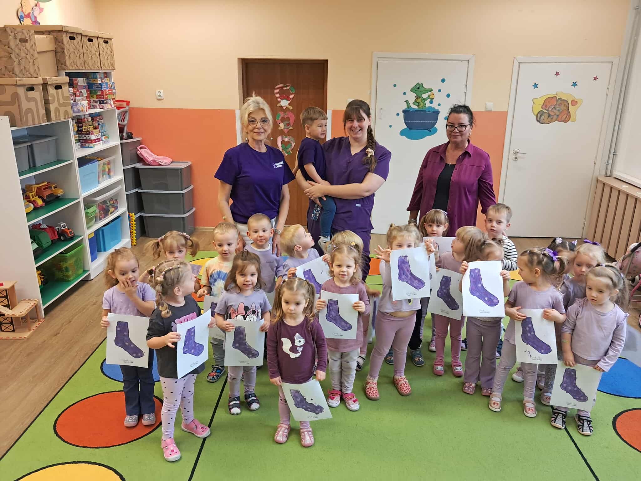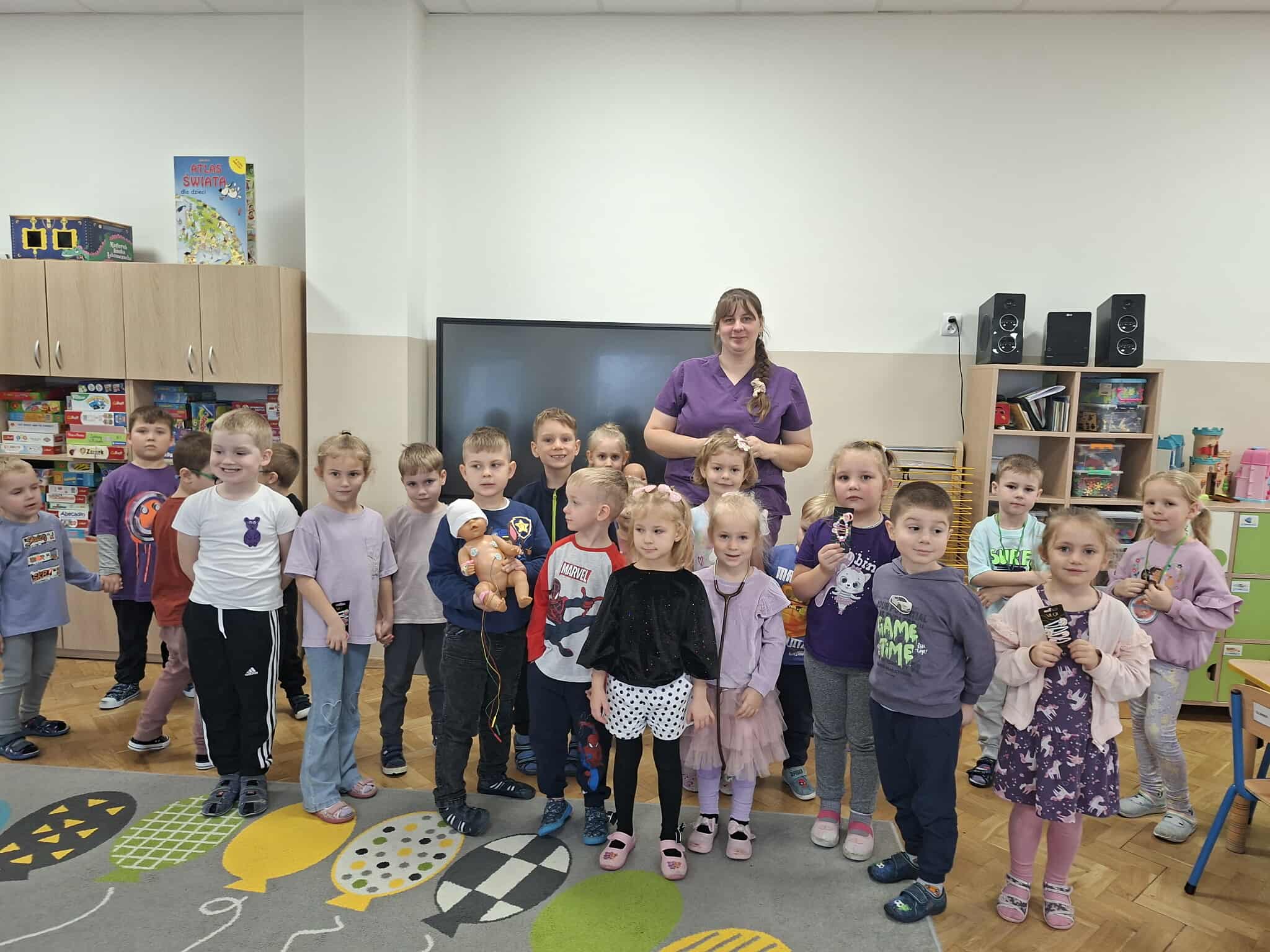 14 listopada nasze przedszkolaki odwiedziła mama Maćka – pielęgniarka, ze szpitala Pro-Medica w Ełku, która opowiedziała dzieciom o obchodach Światowego Dnia Wcześniaka. To szczególny dzień, podczas którego zwracamy uwagę na potrzeby najmniejszych i najbardziej wrażliwych dzieci, które przyszły na świat przedwcześnie. Tego dnia dzieci przyszły ubrane na fioletowo - w kolor symbolizujący kampanię wspierającą wcześniaki i ich rodziny.